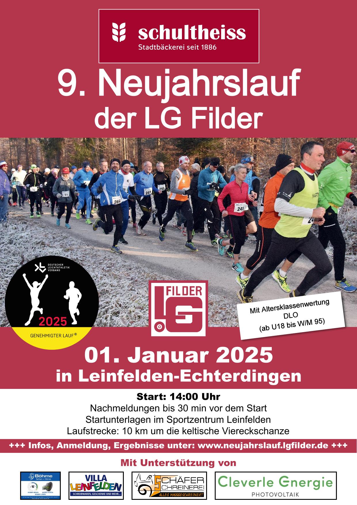 Der 10 km-Lauf um die keltische Viereckschanze startet um 14 Uhr. Im Ziel wartet heißer Tee und Punsch, sowie Stollen und Lebkuchen von der Stadtbäckerei Schultheiss. Voranmeldungen sind möglich bis 21.12. Nachmeldungen bis 30 min vor dem Start im Sportzentrum Leinfelden. Es gibt keine Nachmeldegebühr. Alle Infos zum Lauf auf www.neujahrslauf.lgfilder.de