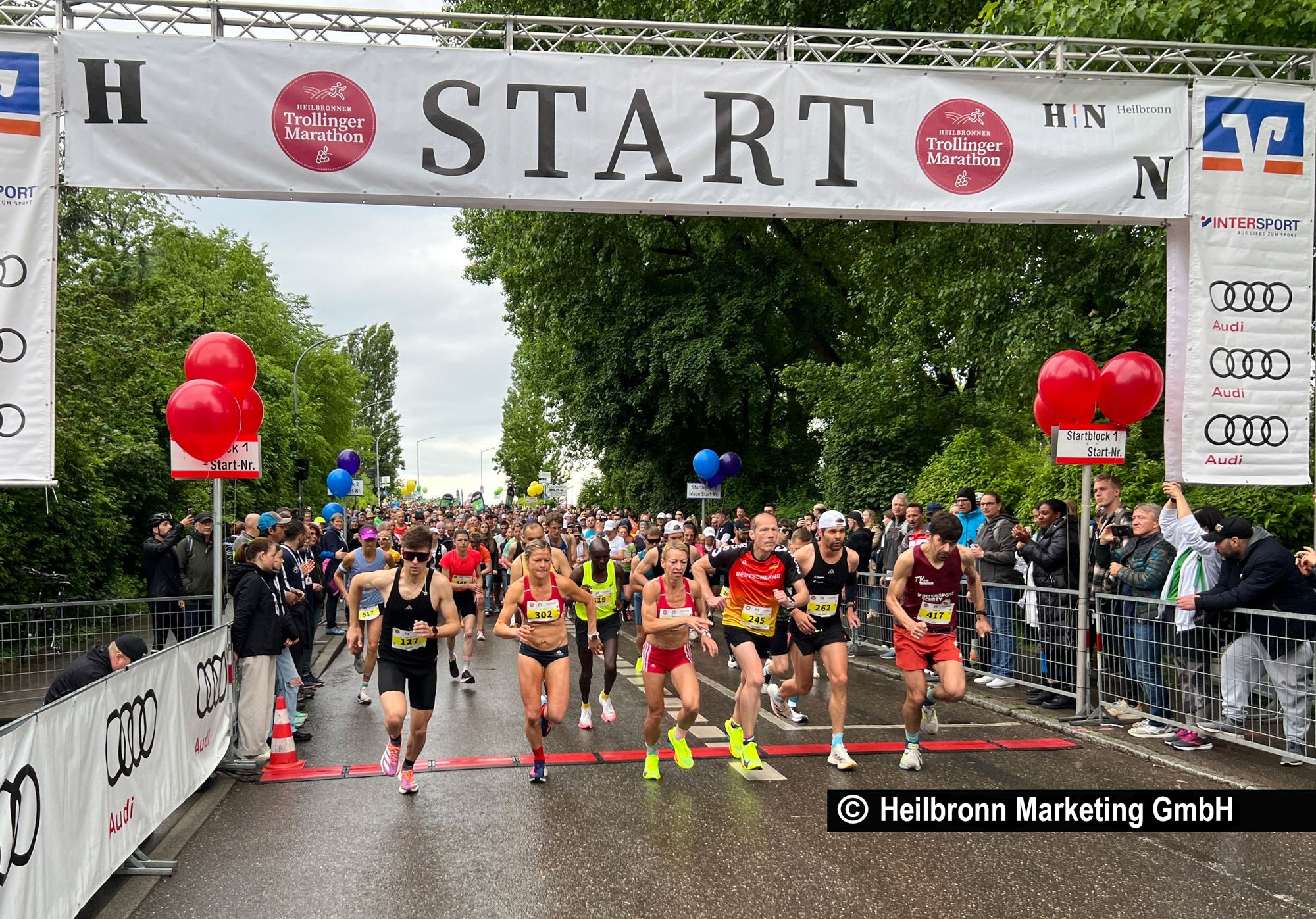 Pünktlich um 8:45 Uhr starteten 473 (plus 27 Staffeln) Langstreckenläuferinnen und -Läufer, die es beim 22. Trollinger Marathon mit der Königsdisziplin aufnahmen, dem Marathon. Für den Halbmarathon, das mit Abstand größte Teilnehmerfeld mit 2.693 Startern knallte die Pistole von Sportbürgermeisterin Agnes Christner um 10 Uhr ein zweites Mal, bevor um 10:45 Uhr die Läuferinnen und Läufer auf die gut nachgefragte 10-km-Distanz (1.446 Starter) in der Badstraße an den Start gingen. Dann ging es Knall auf Fall weiter mit den Startschüssen: Um 10:50 starteten 548 Walker und Nordic, und kurz bevor bereits die Sieger des Marathons und Halbmarathons auf die Zielgerade im Frankenstadion einbogen, starteten um 10:55 Uhr noch schnell die 345 Teilnehmer der neuen Kurz-Distanz, dem Zehnteleslauf (4,5 km).