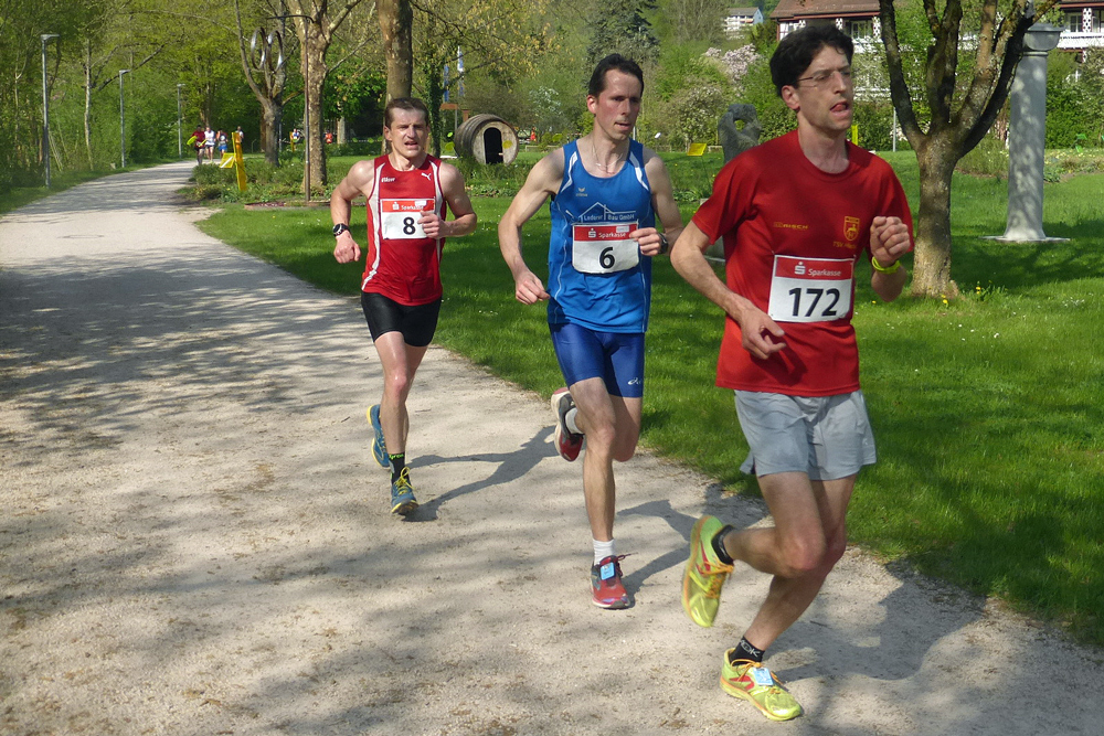 Vom Start weg drückte der Vorjahresdritte Levin Maurer auf das Tempo. Er lag fast das gesamte Rennen 20 bis 30 Meter vor Tim Weber (SV Oberkollbach, der anfangs noch von Stefan Buder (Tempomacher Ludwigsburg) begleitet wurde. Eine sechsköpfige Verfolgergruppe wurde von dem Jugendlichen Vinzens Erath (nicht im Ziel) angeführt. Sie bestand aus Daniel Kirchenbauer (SV Oberkollbach/7. in 35:28/1. M35), Sebastian Groteloh (TSV Hirschau), Viktor Luft (SV Rotfelden/4. in 34:52/2. M40), Guido Schmid (TSV Wildbad/6. in 34:59/1. M45) und Armin Gotsch (VfL Ostelsheim/10. in 37:26/3. M45). Levin Maurer konnte gegen Ende des Rennens seinen Vorsprung vergrößern und siegte mit 34:06 deutlich. Weil er aber 2 Runden vor Schluss sein Trikot ausgezogen hatte, gab es noch eine Verwarnung von Seiten des Veranstalters. Ein solcher Regelverstoß hat in der Vergangenheit schon mehrfach zur Disqualifikation geführt. Sebastian Groteloh überlief nicht nur Stefan Buder (5. in 34:58), er konnte sogar dank seines legendären Endspurts noch Tim Weber (3. in 34:37/1. M30) kurz vor dem Ziel abfangen und Rang 2 in 34:34 (1. M45) belegen.