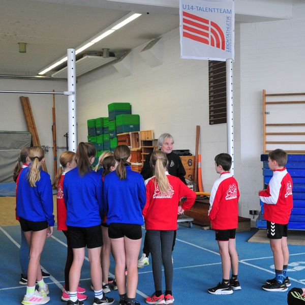 Während die möglichen Medaillengewinner von morgen trainieren, schmückt nun ein großes Banner die Trainingsstätte des U14-Talentteams REGION Baar – Neustadt in der Löffinger Leichtathletikhalle. Kreisvorsitzender Niklas Leber, auch besonders engagiert im Jugendteam des BLV, konnte in seiner Begrüßung den Nachwuchs zu den Leistungen in der vergangenen Saison beglückwünschen. Er war zuversichtlich, dass durch die regelmäßig stattfindende Stützpunktarbeit sich ein weiterer Aufschwung im nächsten Jahr einstellen wird. Teamleiter Holger Urbainczyk lobte das Zusammengehörigkeitsgefühl der Nachwuchsathleten aus den beiden Kreisen im bisherigen Training und bei den vergangenen Wettkämpfen.